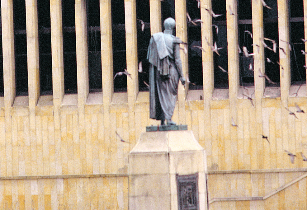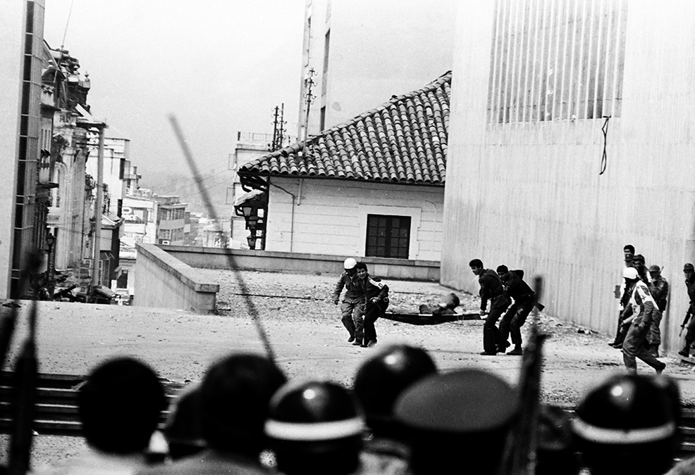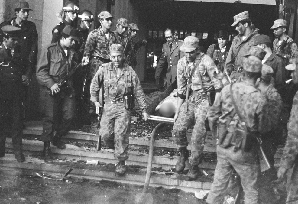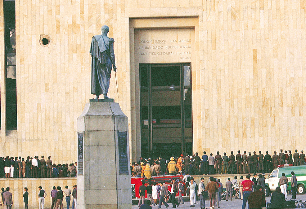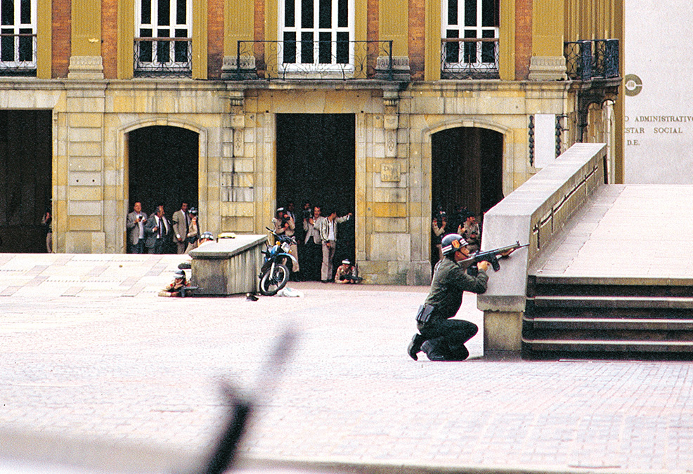 Una ráfaga rompe la rutina. Miembros del M-19 irrumpen fuertemente armados por la puerta principal. Los disparos y gritos ahuyentan hasta a las palomas.