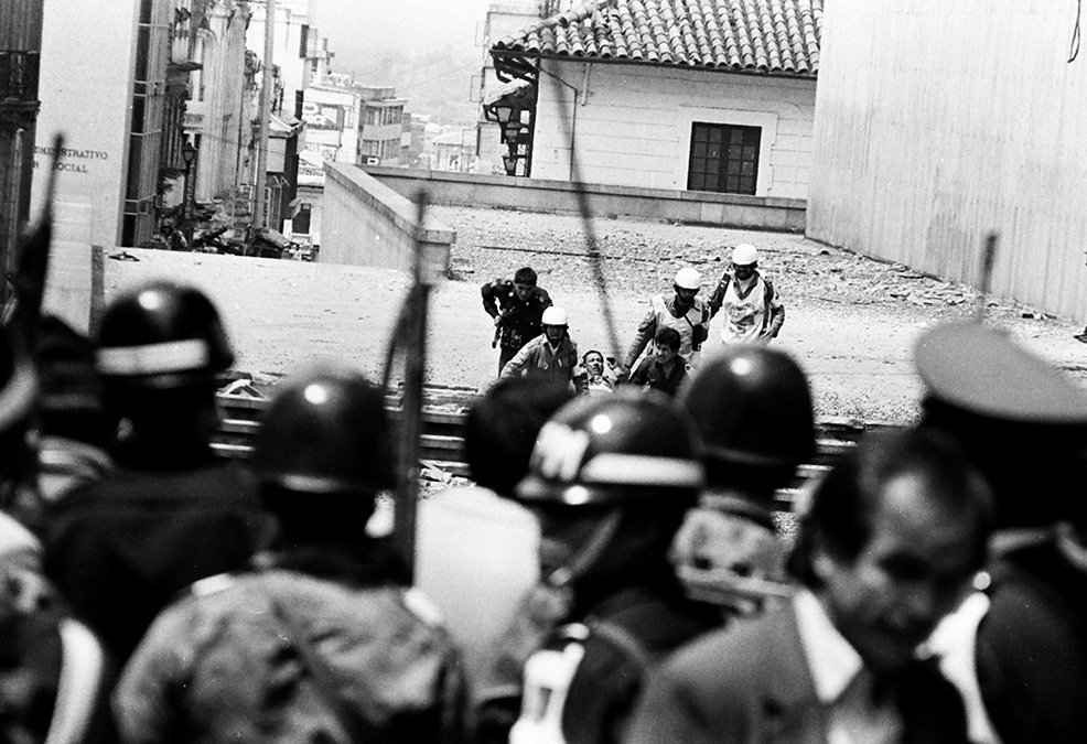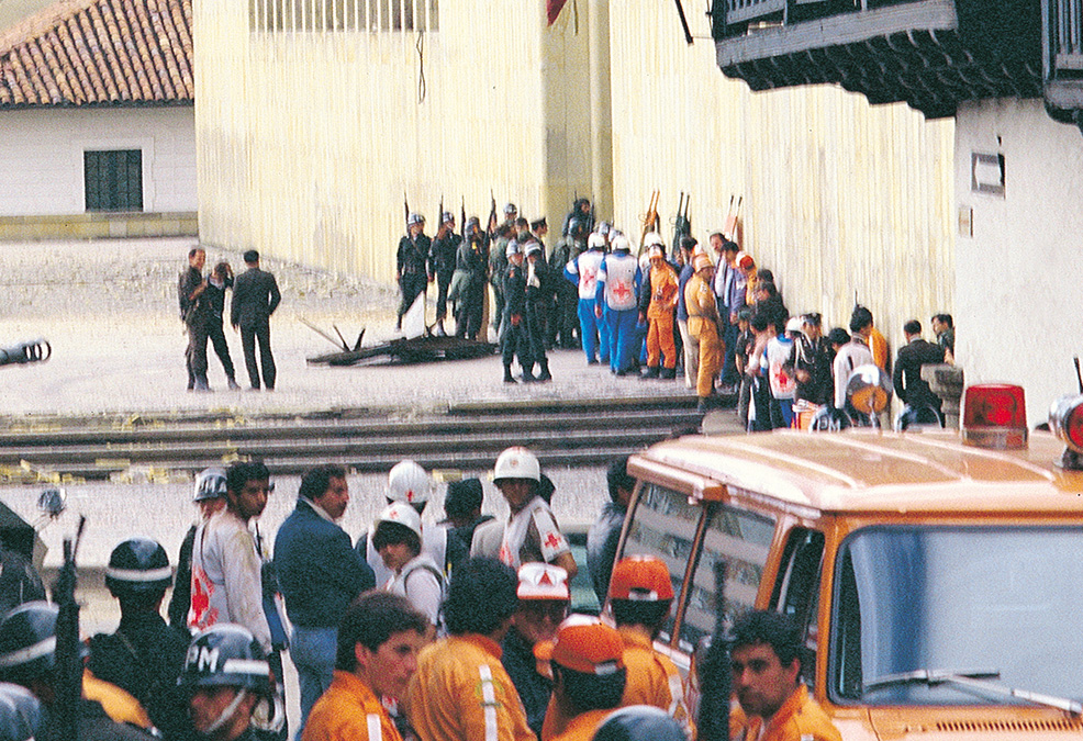 Respuesta inmediata. Miembros de la Fuerza Pública rodean el Palacio buscando posiciones defensivas. Entretanto, la Cruz Roja y el Cuerpo de Bomberos se preparan para atender a los heridos.