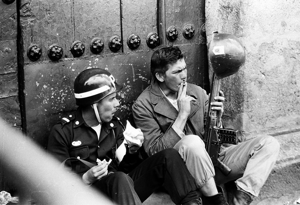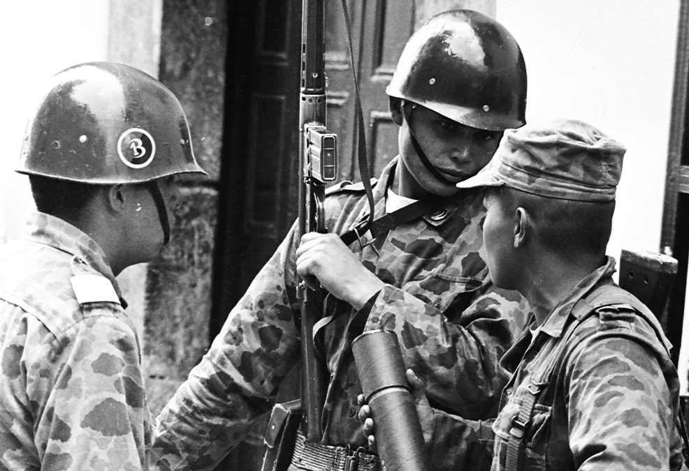 Soldados portan su armamento mientras permanecen en posición de combate en los alrededores del Palacio. La tensión se refleja en sus rostros durante las operaciones.