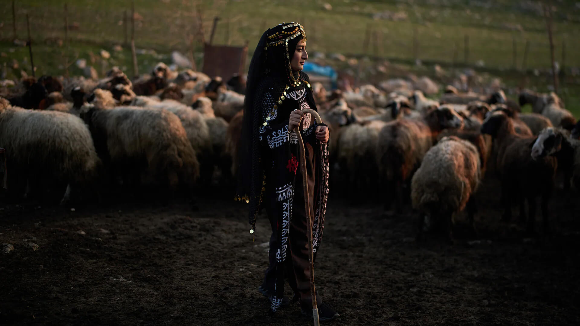 Con un vestido tradicional, Parzhin Jasem posa para una foto junto a ovejas que pertenecen a su tío, durante una reunión familiar para romper el ayuno con una comida de iftar en el mes sagrado musulmán del Ramadán, en el pueblo de Gulp, Irak, el martes 17 de marzo de 2026.