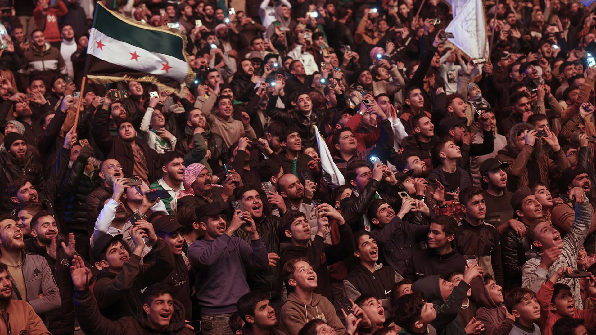 Los manifestantes asisten y celebran un mitin conmemorativo del decimoquinto aniversario del levantamiento sirio contra el régimen de Bashar Assad, en Idlib, Siria, a última hora del miércoles 18 de marzo de 2026.