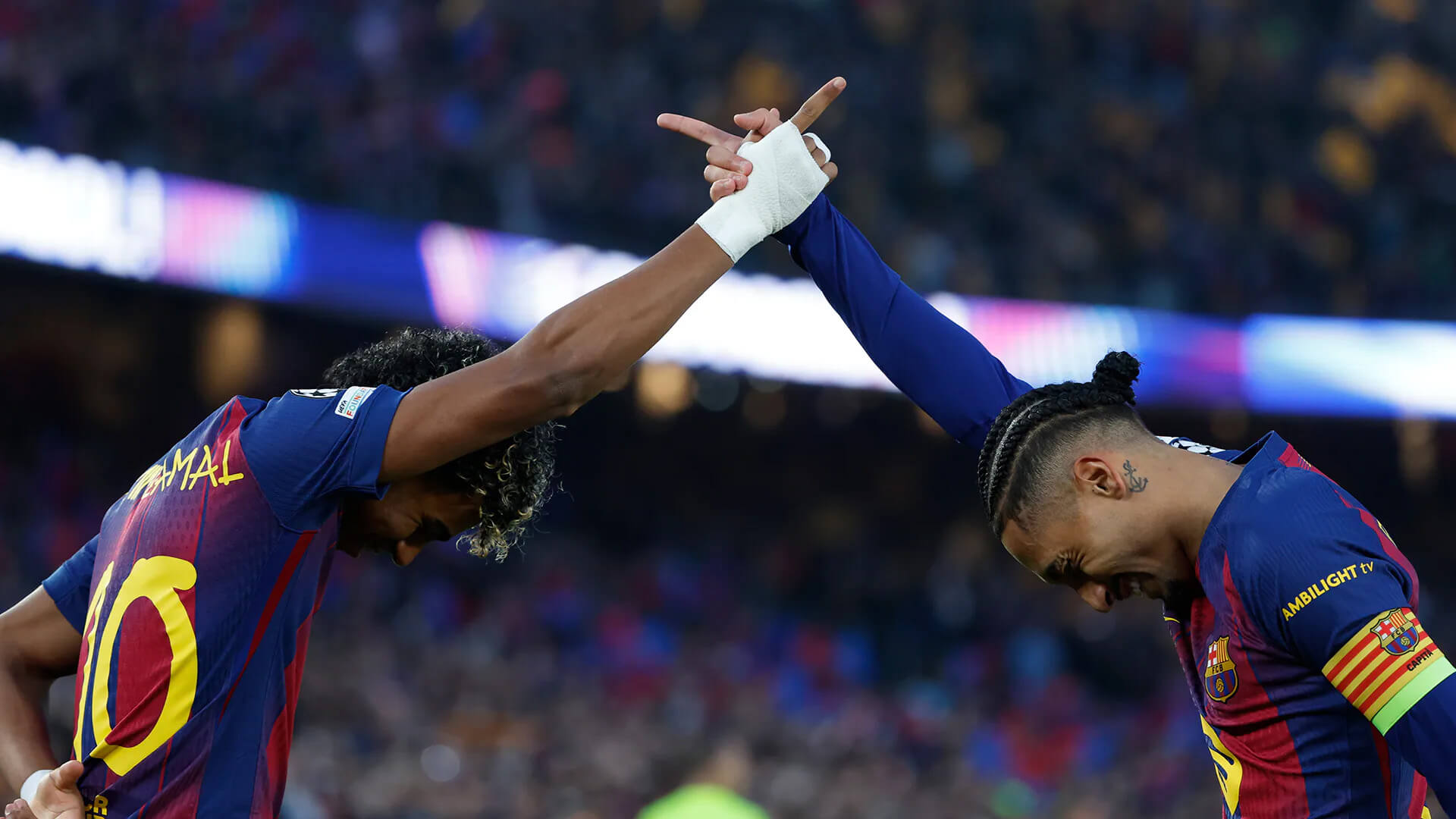 Raphinha del Barcelona, a la derecha, celebra con su compañero de equipo Lamine Yamal después de marcar el primer gol de su equipo durante los octavos de final de la Liga de Campeones, en el partido de fútbol de segunda vuelta entre el FC Barcelona y el Newcastle United FC, en Barcelona, España, el miércoles 18 de marzo de 2026.