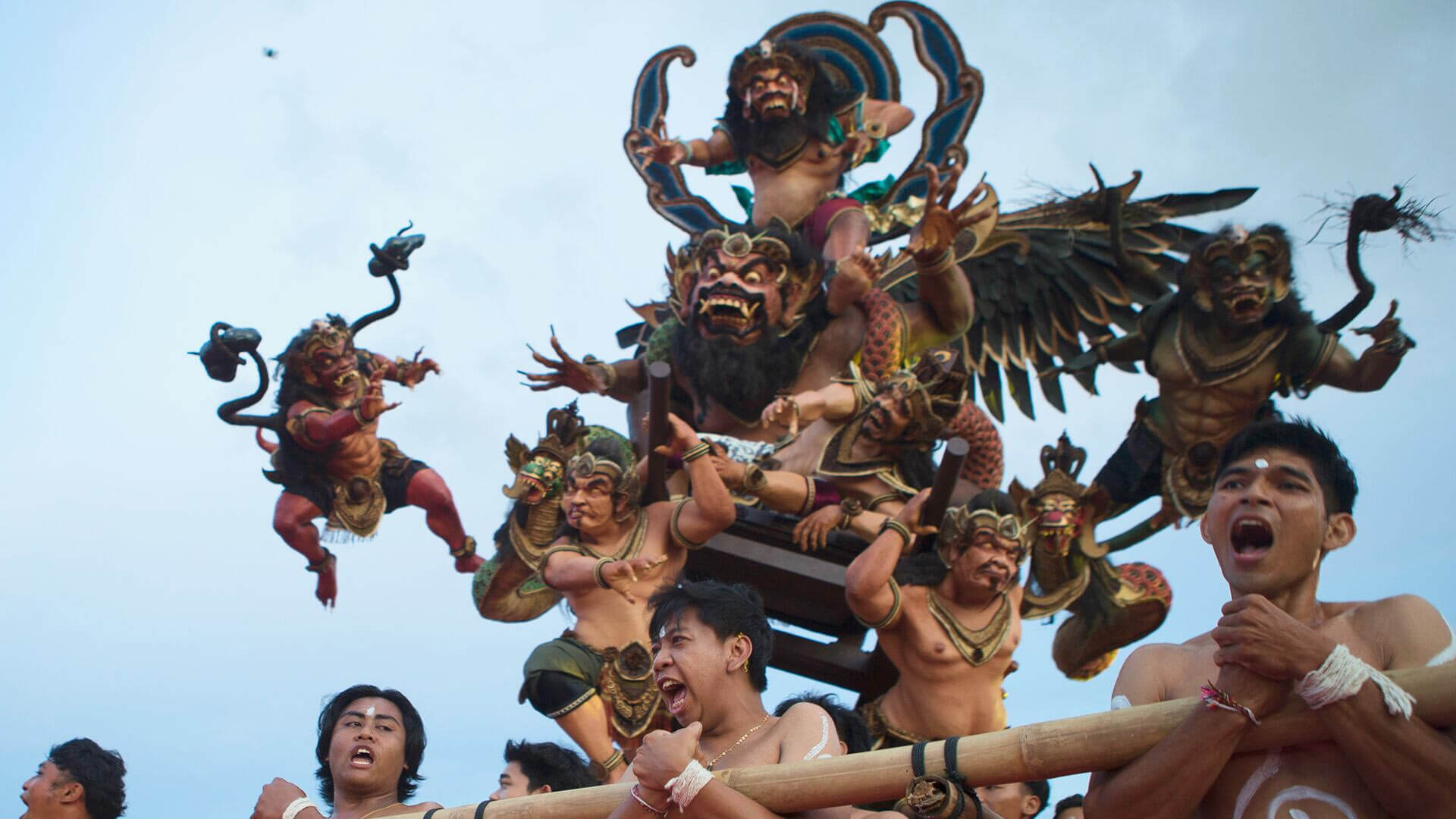 Los participantes llevan efigies gigantes de ogoh-ogoh que representan espíritus malignos, para ser purificadas durante un desfile la noche anterior a Nyepi, el Día de Silencio que marca el Año Nuevo hindú balinés, en Denpasar, Bali, Indonesia, el miércoles 18 de marzo de 2026.