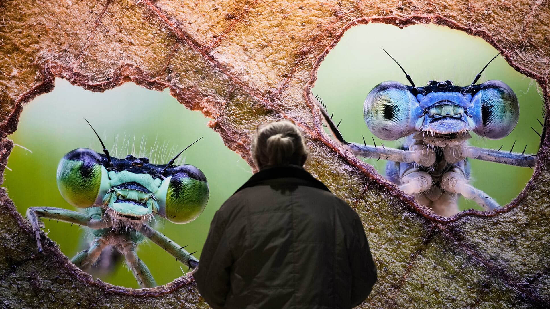 Un visitante observa una fotografía de dos pequeñas libélulas durante la apertura de la nueva exposición “Forest Worlds”, en el monumento industrial Gasometer, anteriormente el soporte de gas tipo disco más grande de Europa, en Oberhausen, Alemania, el miércoles 18 de marzo de 2026.