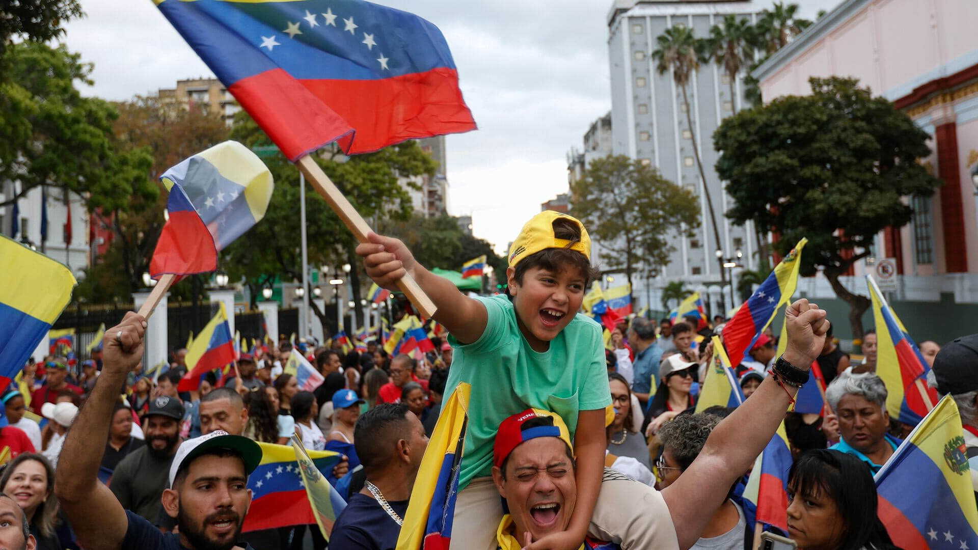 Los fanáticos venezolanos celebran un día después de la victoria de su equipo sobre Estados Unidos en el partido del campeonato del Clásico Mundial de Béisbol, en el palacio presidencial de Miraflores, en Caracas, Venezuela, el miércoles 18 de marzo de 2026.