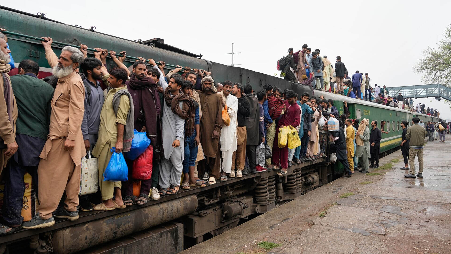 La gente aborda un tren de pasajeros abarrotado para llegar a sus hogares, en la víspera de las vacaciones de Eid al-Fitr, que marca el final del mes sagrado de ayuno islámico del Ramadán, en una estación de tren en Lahore, Pakistán, el jueves 19 de marzo de 2026.