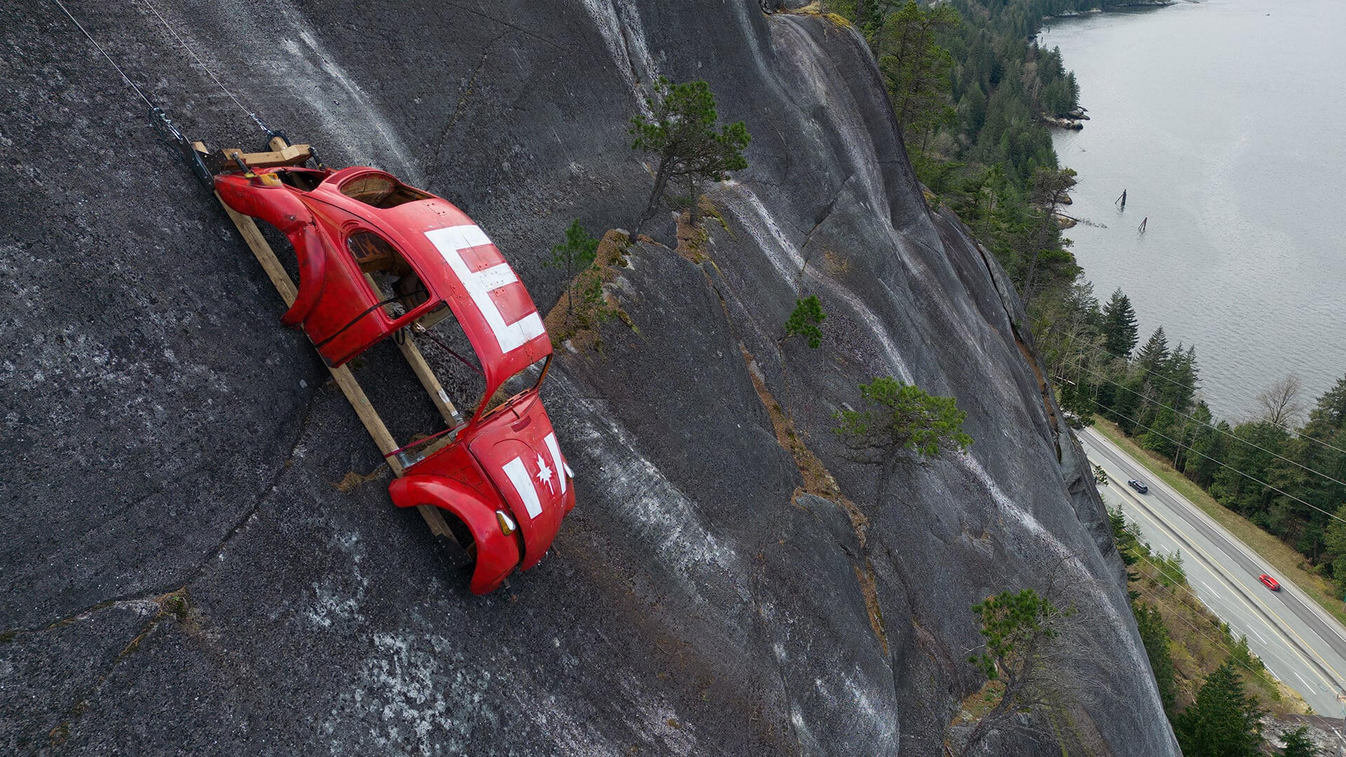 El caparazón de un Volkswagen Escarabajo cuelga de un acantilado sobre la autopista Sea-to-Sky en Squamish, Columbia Británica, el lunes 6 de abril de 2026. El vehículo apareció días antes en la roca con una gran E en el techo, como parte de una tradición de estudiantes de ingeniería de la Universidad de Columbia Británica de colocar objetos en lugares de difícil acceso.