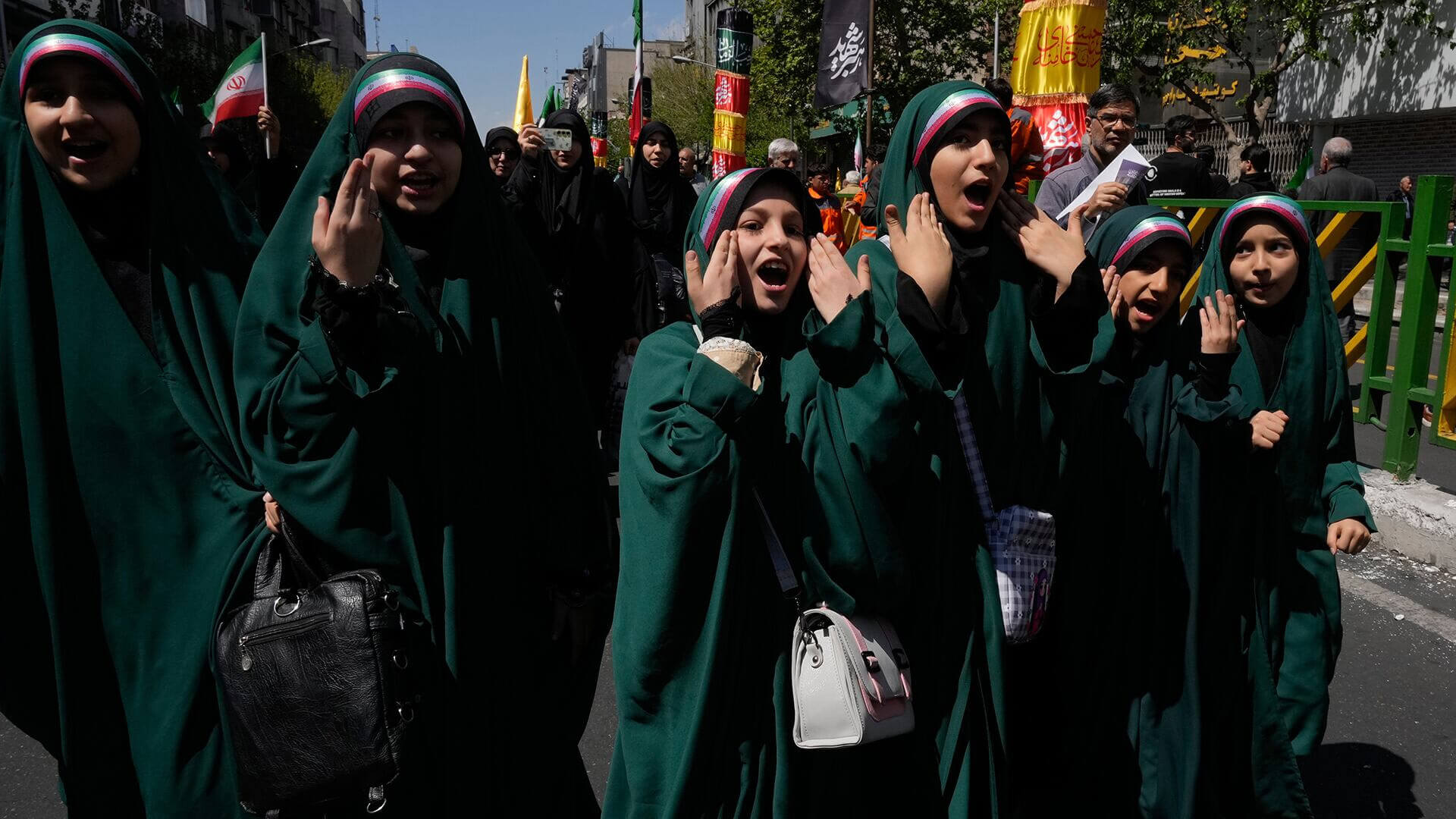 Un grupo de niñas canta durante una ceremonia de duelo que marca el día 40 desde la muerte del líder supremo iraní, el ayatolá Alí Jamenei, el jueves 9 de abril de 2026. Este fue asesinado en medio del conflicto de Estados Unidos e Israel en Teherán, Irán.