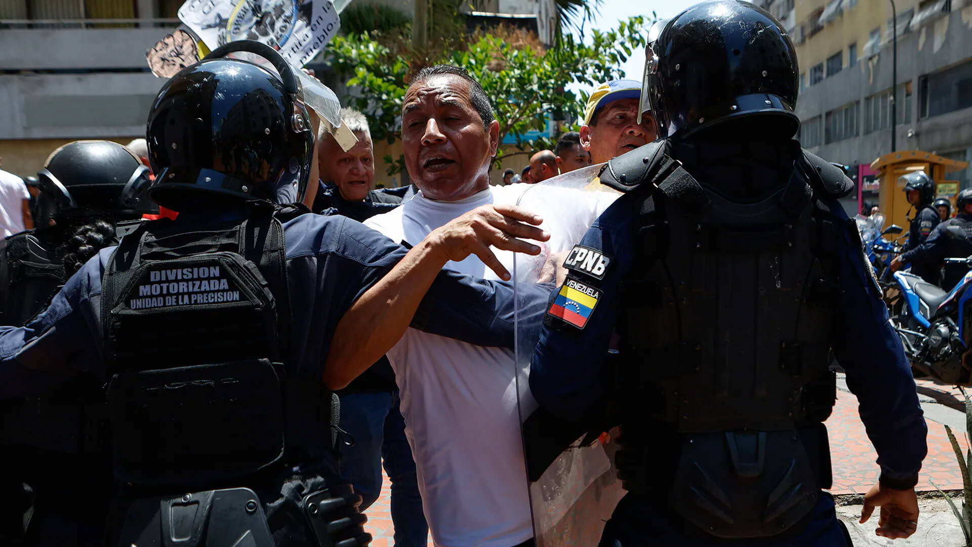 La Policía Nacional Bolivariana bloquea el avance de manifestantes que exigen mejores salarios, pensiones y beneficios hacia el Palacio de Miraflores en Caracas, Venezuela, el jueves 9 de abril de 2026.