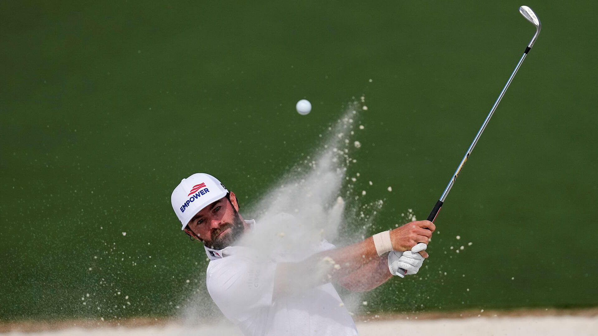 Cameron Young batea desde el búnker en el segundo hoyo durante la primera ronda del torneo de golf Masters en el Augusta National Golf Club, el jueves 9 de abril de 2026.