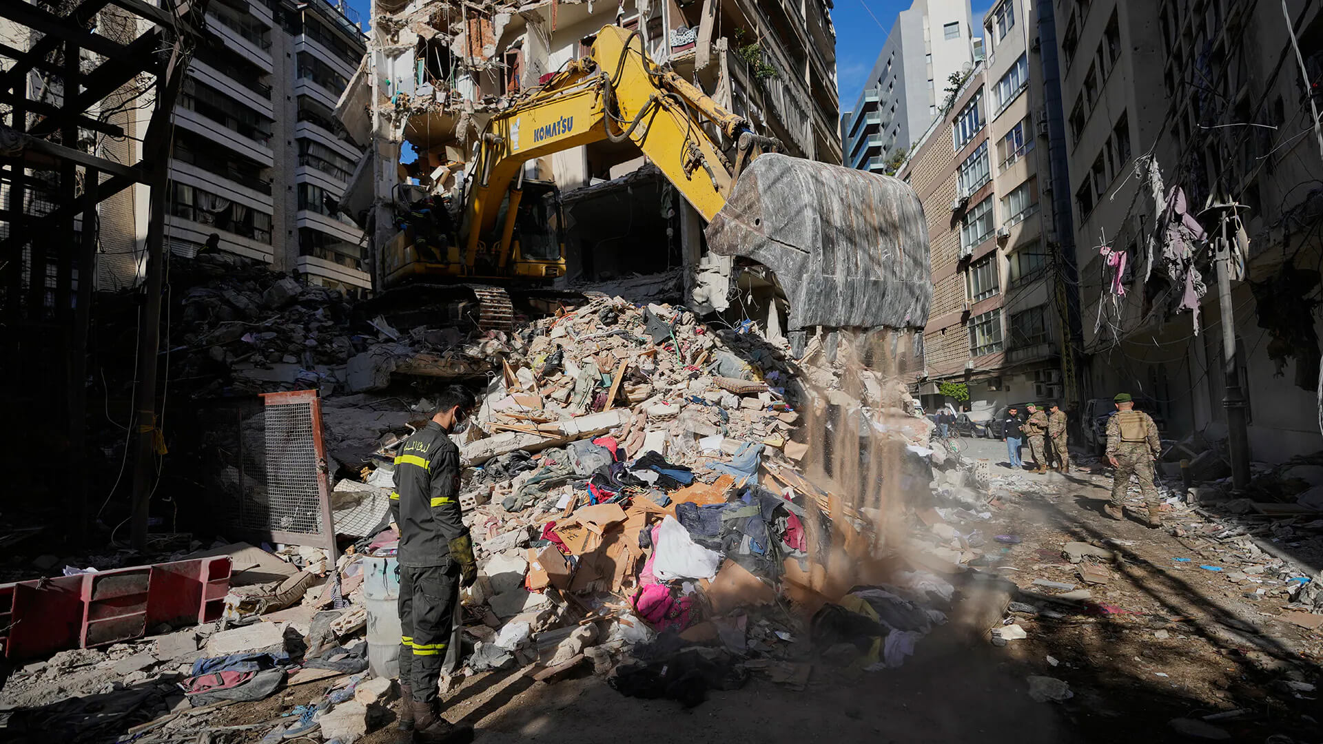 Un trabajador libanés de defensa civil observa cómo una excavadora remueve los escombros de un edificio destruido en un ataque aéreo israelí en Beirut, Líbano, el jueves 9 de abril de 2026.
