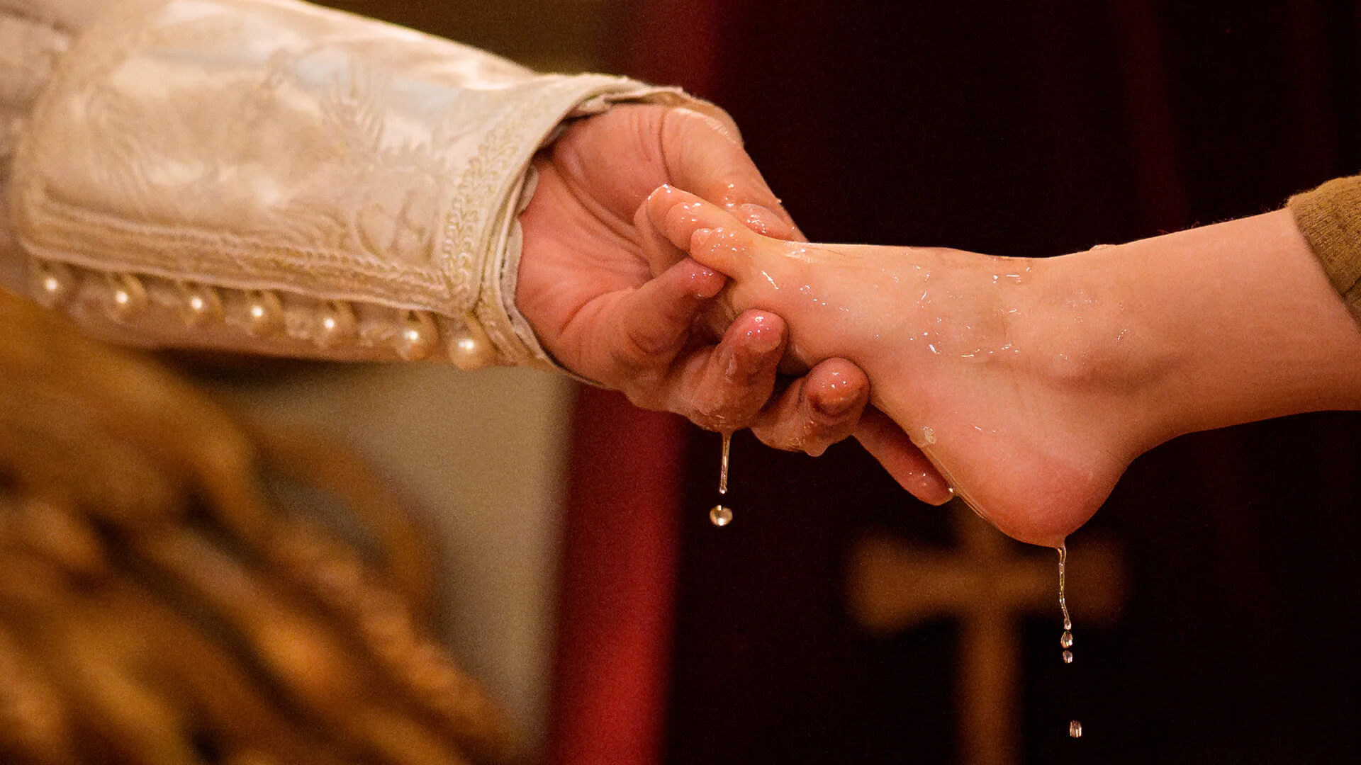 El arzobispo nacido en Irak, Datev Hagopian, lava simbólicamente el pie de un niño durante un servicio religioso del Jueves Malvado, en la Catedral Armenia en Bucarest, Rumania, el jueves 9 de abril de 2026.