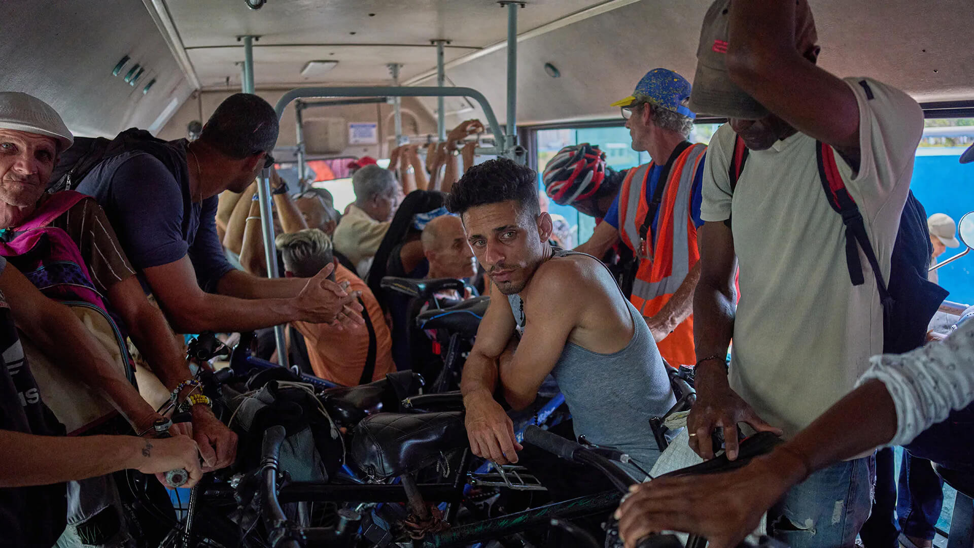 Personas con bicicletas y motocicletas viajan en un autobús público mientras cruzan el Túnel de la Bahía en La Habana, Cuba, el miércoles 8 de abril de 2026.