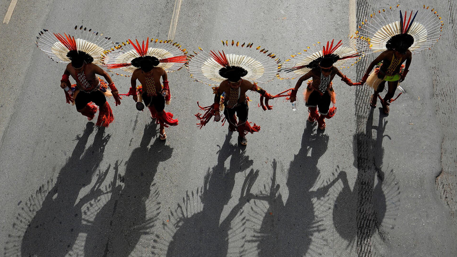 Integrantes del pueblo Karajá participan en una marcha durante el Acampamento Terra Livre 2026, una movilización indígena en defensa de los derechos territoriales y la protección del medio ambiente, en Brasilia, Brasil, el jueves 9 de abril de 2026.