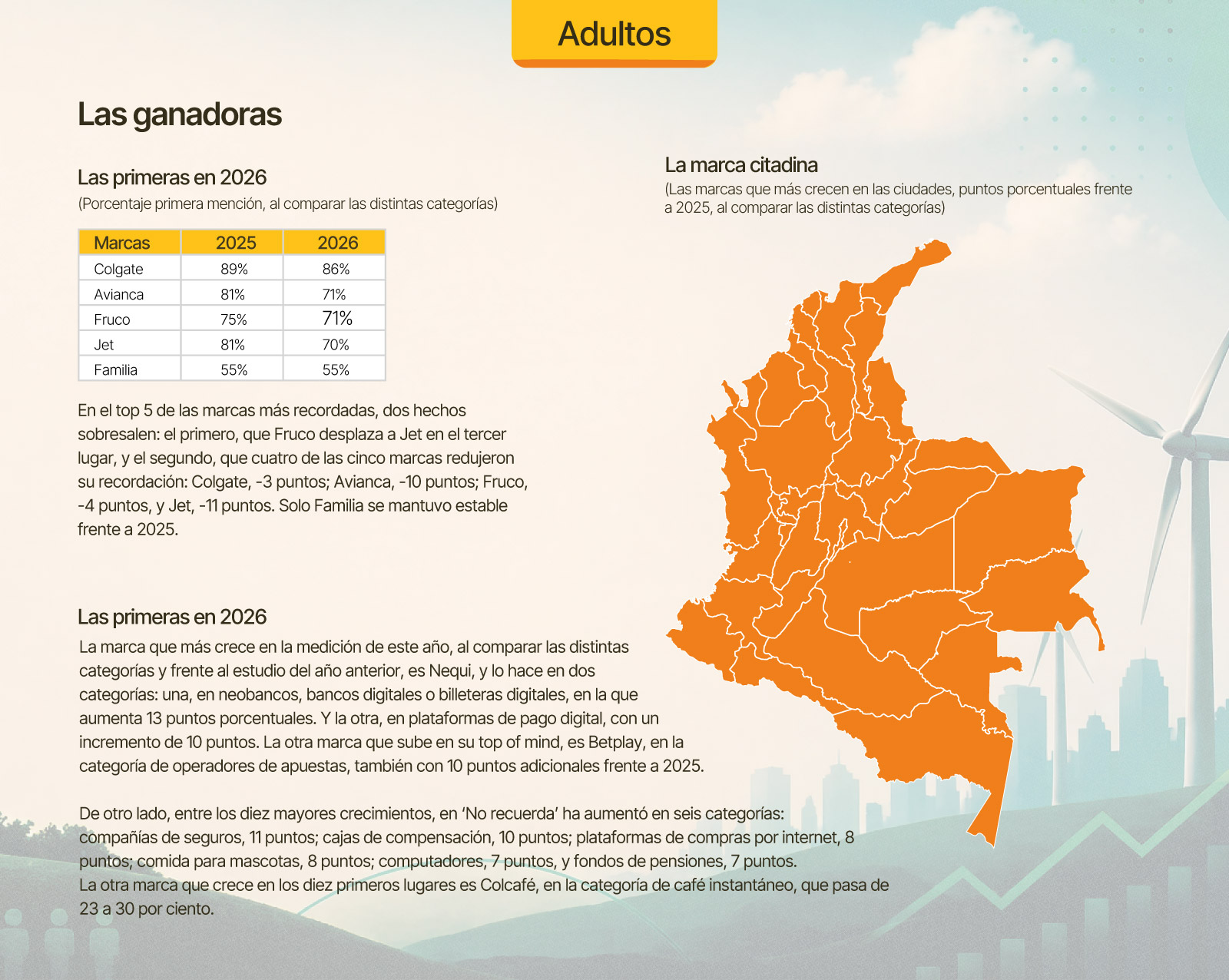 Nequi ha tenido un papel relevante en el estudio de este año: Sobresale en dos categorías: neobancos, bancos digitales o billeteras digitales, y en plataformas de pago digital. Y en la capital de la República paso de 30 (en 2025) a 41 (este año) por ciento. Entre los mayores incrementos en Bogotá, se destaca el ‘No recuerda’ que, entre los primeros cinco lugares, está en dos categorías: comida para mascotas y compañías de seguros, con 11 puntos adicionales frente al año pasado. Dentro de las marcas, se destacan los aumentos de Betplay, 11 puntos, en operadores de apuestas, y Sol, 10 puntos, en chocolate caliente.