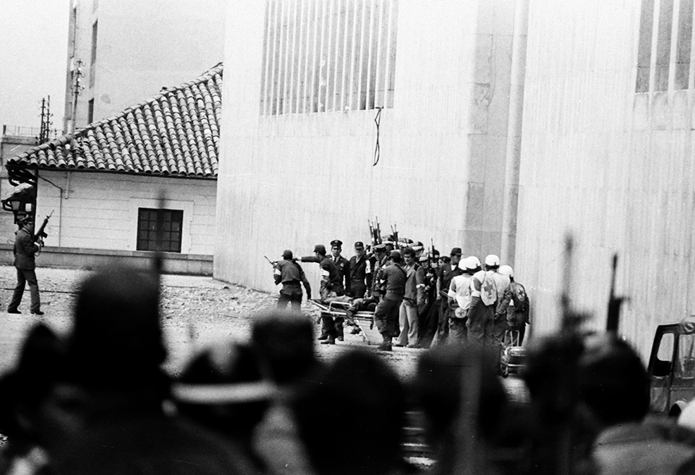 Una ráfaga rompe la rutina. Miembros del M-19 irrumpen fuertemente armados por la puerta principal. Los disparos y gritos ahuyentan hasta a las palomas.