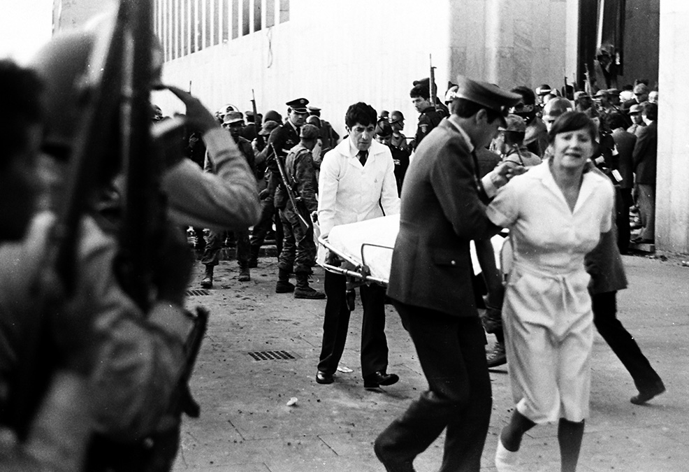 Una empleada del Palacio de Justicia es evacuada con vida por los uniformados; su rostro refleja el desconcierto.