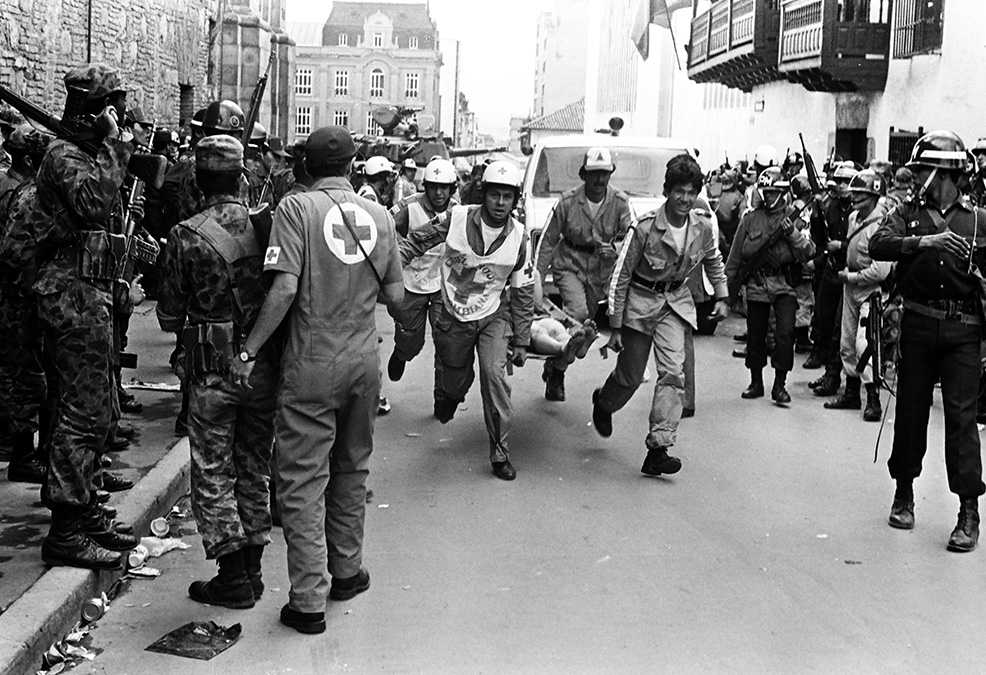 Respuesta inmediata. Miembros de la Fuerza Pública rodean el Palacio buscando posiciones defensivas. Entretanto, la Cruz Roja y el Cuerpo de Bomberos se preparan para atender a los heridos.