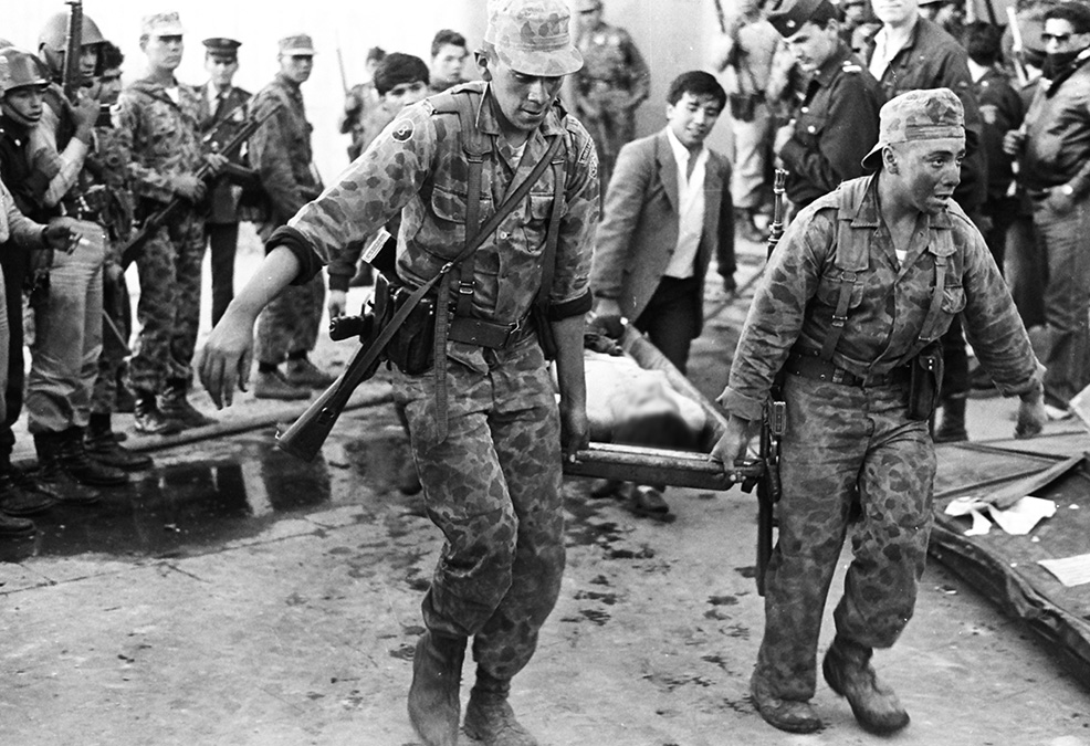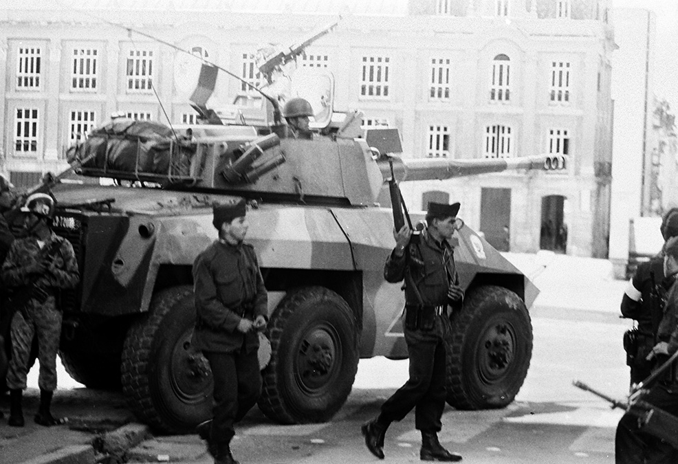 Soldados portan su armamento mientras permanecen en posición de combate en los alrededores del Palacio. La tensión se refleja en sus rostros durante las operaciones.