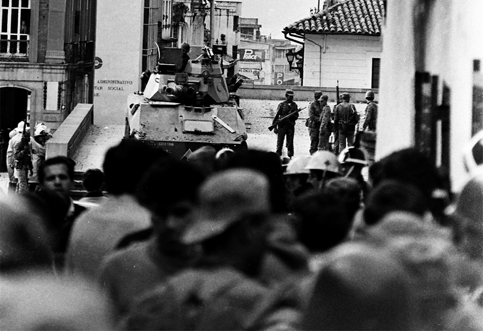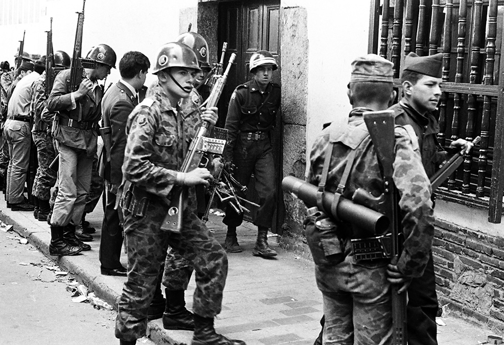Varios soldados permanecen atentos desde el balcón de la Casa del Florero, mientras un tanque de guerra y otros uniformados resguardan el lugar donde se libran intensos combates.