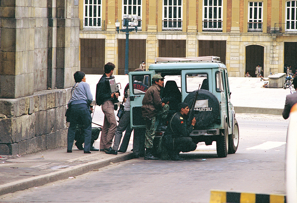 Periodistas reportan los hechos detrás de una camioneta, donde se resguardan junto a militares armados que vigilan los movimientos en torno al Palacio de Justicia.